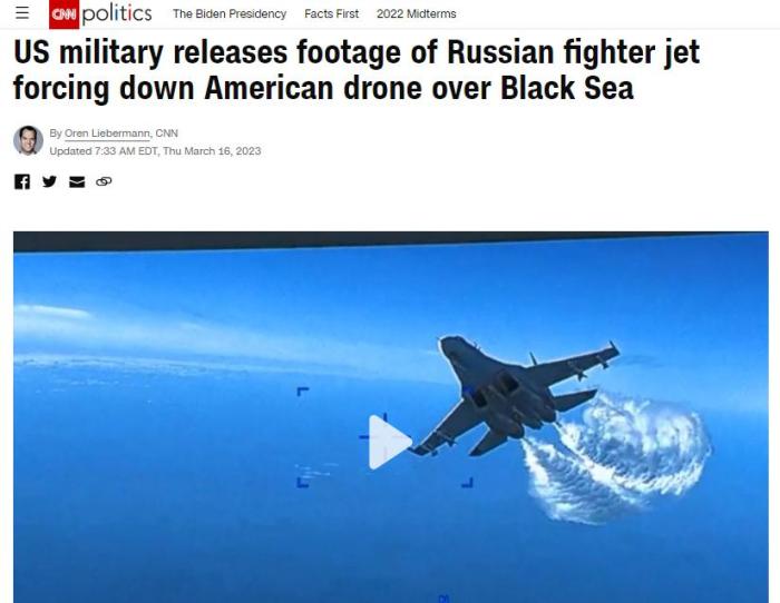 報(bào)道還稱,當(dāng)俄羅斯蘇-27戰(zhàn)斗機(jī)再次靠近時(shí),又一次“傾倒燃料”。隨后,俄羅斯蘇-27戰(zhàn)斗機(jī)與美國MQ-9“死神”無人機(jī)“相撞”,導(dǎo)致螺旋槳受損,無人機(jī)的視頻也由此中斷。不過,CNN同時(shí)指出,俄羅斯否認(rèn)發(fā)生了“碰撞”。