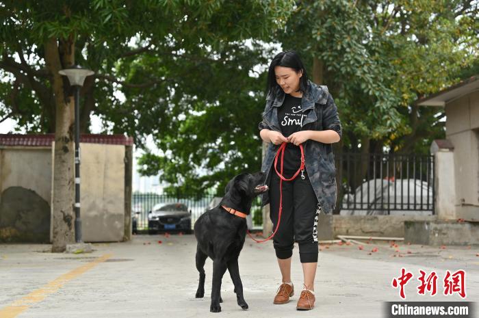崔靜宜與其訓(xùn)練犬“肉排”互動(dòng)?!∮峋?攝
