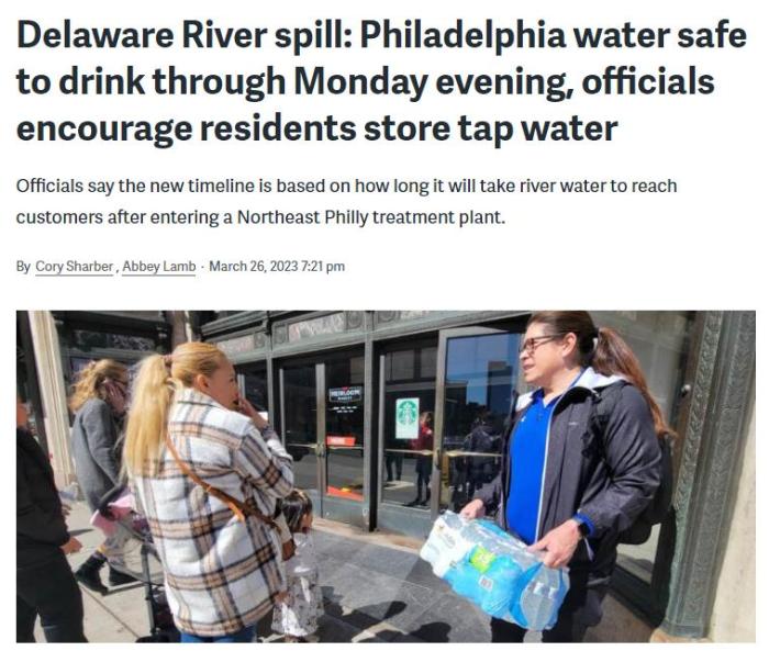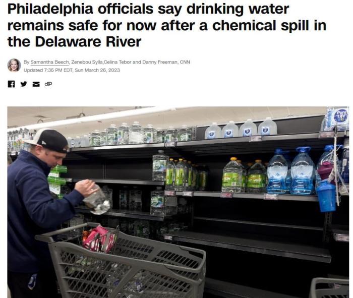 中新網(wǎng)3月27日電 綜合外媒報(bào)道,近日,美國賓州布里斯托爾一家工廠發(fā)生泄漏事故,大量化學(xué)物質(zhì)流入特拉華河一條支流中。事故發(fā)生后,費(fèi)城官員建議當(dāng)?shù)孛癖娛褂闷垦b水,引發(fā)恐慌性購買。