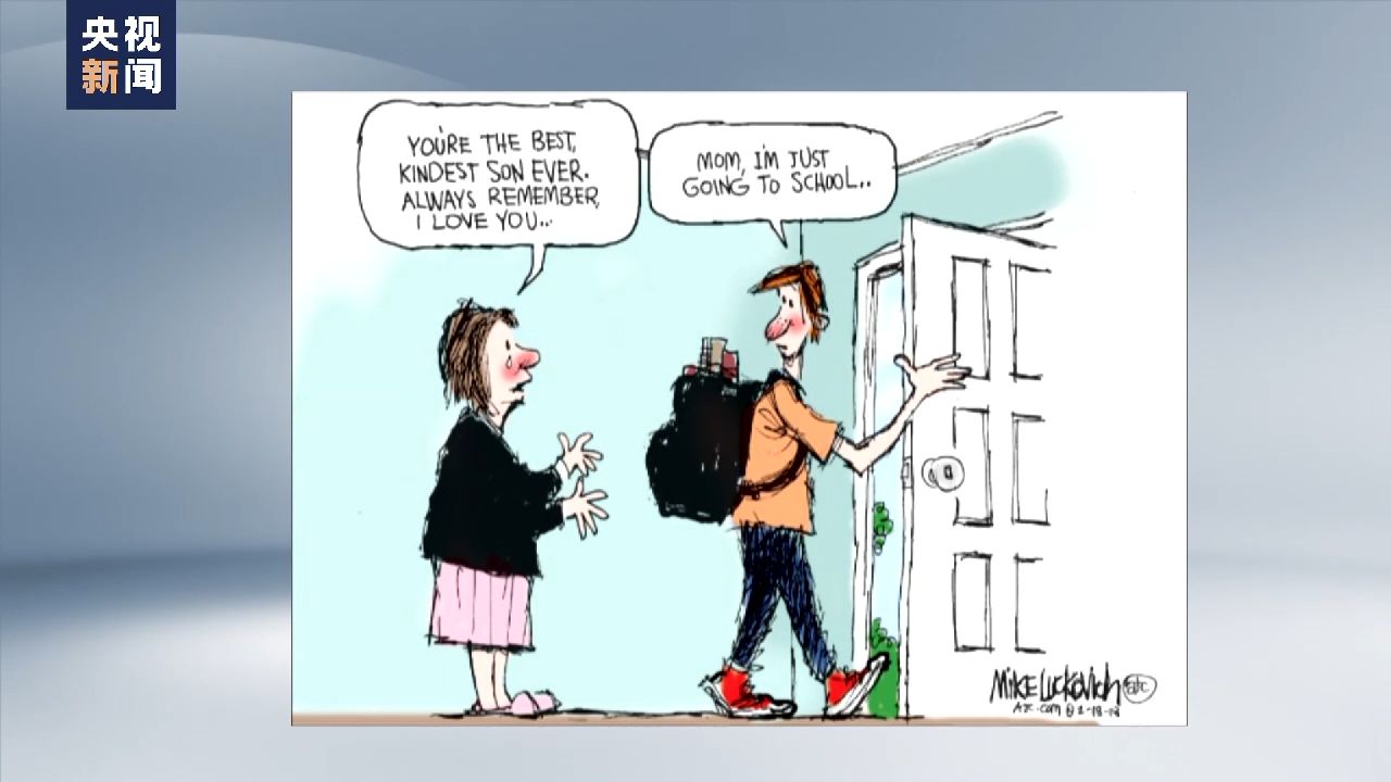 槍支暴力已經(jīng)成為美國孩子的“頭號(hào)殺手”。在這幅漫畫中,母親流著眼淚,對(duì)準(zhǔn)備出門上學(xué)的孩子叮囑道,“你是最好、最善良的兒子,永遠(yuǎn)要記得這一點(diǎn),我愛你?!?孩子則有點(diǎn)疑惑地說,“媽媽,我只是去學(xué)校?!?這就是校園槍擊案頻發(fā)令無數(shù)父母終日膽戰(zhàn)心驚的真實(shí)寫照。