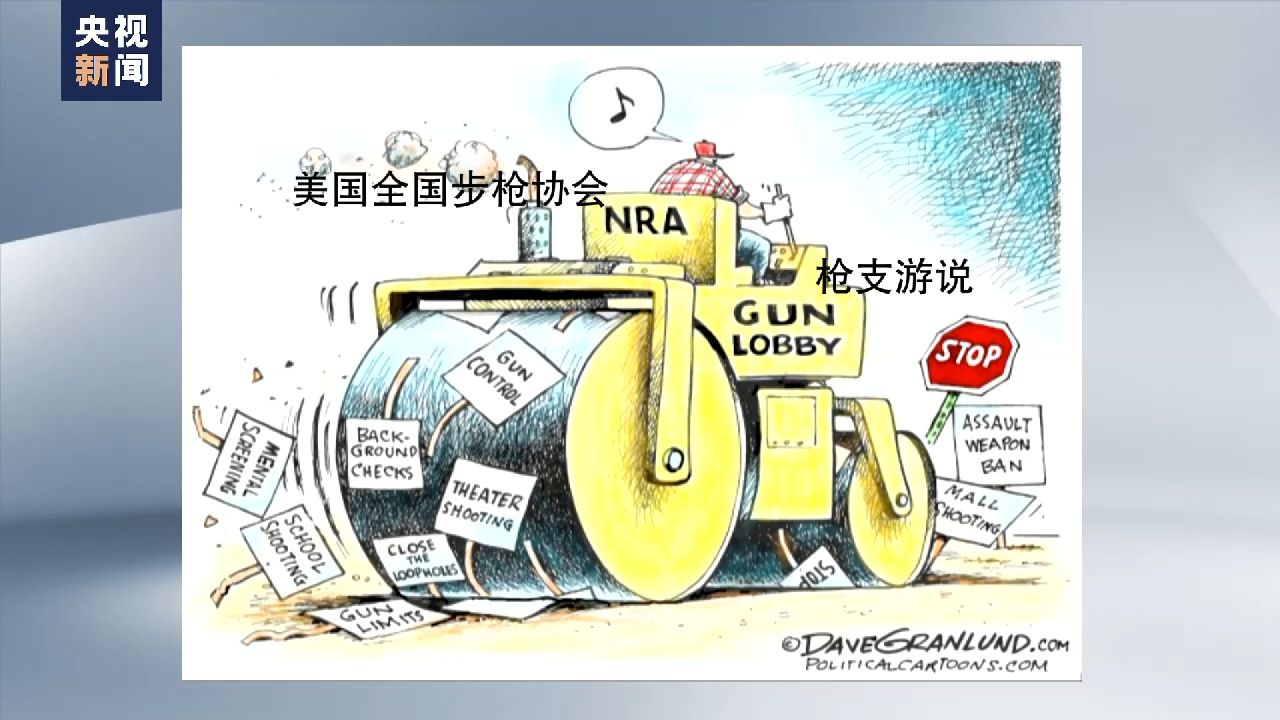 在這幅漫畫中,一名男子聽著音樂,漫不經(jīng)心地開著一輛寫有“美國全國步槍協(xié)會(huì)”、“槍支游說”字樣的壓路機(jī)一路向前,撞倒了前方赫然在目的“停止”標(biāo)志。在他身后,“攻擊性武器禁令”、“控槍”、“背景調(diào)查”等標(biāo)志被一一碾壓,接二連三發(fā)生的“校園槍擊”、“劇院槍擊”、“商場槍擊”等慘痛事件也完全被無視。