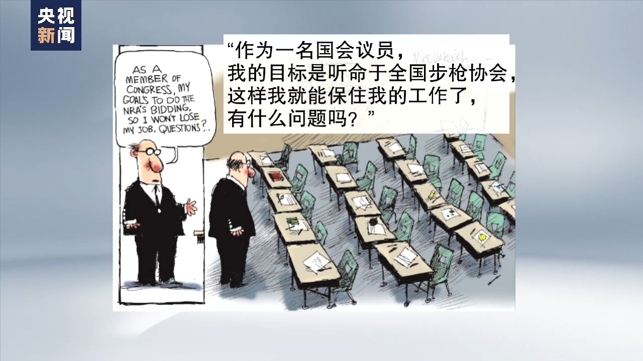 今年,美國已經(jīng)發(fā)生130起造成至少4人死傷的大規(guī)模槍擊事件。政客與利益集團(tuán)的深度捆綁,令美國深陷槍支暴力的“惡性循環(huán)”。不少漫畫對(duì)此都有生動(dòng)的刻畫。