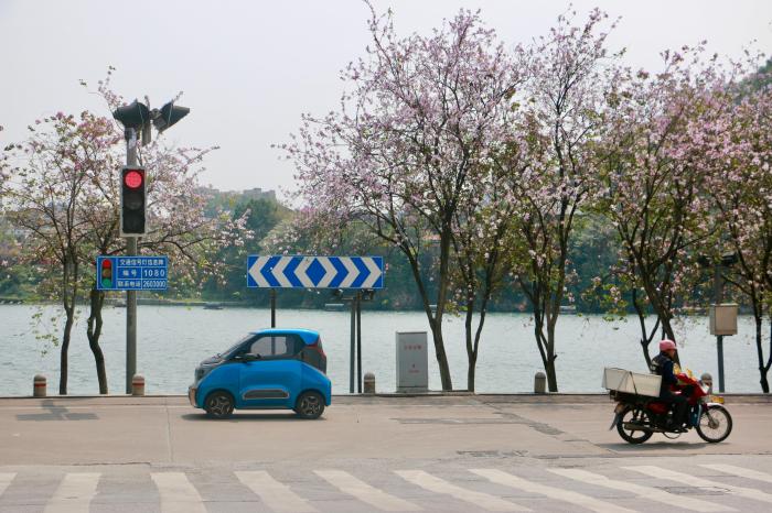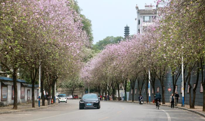 在社交平臺(tái)上看到柳州滿城洋紫荊盛開景色的馮禎雨,專程從湖南長沙市坐動(dòng)車到柳州賞花。她表示:“乘坐當(dāng)?shù)赝瞥龅馁p花專線公交車,領(lǐng)略花開滿城的美景,感受春天的美好和生機(jī),十分愉悅。”