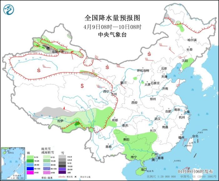 4月9日08時(shí)至10日08時(shí),新疆沿天山地區(qū)、西藏南部和東部、甘肅河西、川西高原北部、內(nèi)蒙古東北部等地部分地區(qū)有小到中雪或雨夾雪,其中,新疆天山山區(qū)的高海拔地區(qū)有中到大雪(5~9毫米)。西藏東南部、四川盆地西部、貴州中南部、湖南南部、廣西大部、廣東西部、海南島大部、遼寧東部等地部分地區(qū)有小雨,其中,新疆伊犁河谷、西藏東南部等地部分地區(qū)有中雨。內(nèi)蒙古中西部、新疆南疆盆地、西北地區(qū)北部、遼寧西部、山東半島等地部分地區(qū)有4~6級(jí)風(fēng),其中,內(nèi)蒙古西北部部分地區(qū)有6~7級(jí)風(fēng),新疆東部、西藏中部等地部分地區(qū)有7~8級(jí)風(fēng)。臺(tái)灣海峽、南海北部和中部、巴士海峽將有6~7級(jí)、陣風(fēng)8級(jí)的東北風(fēng)。