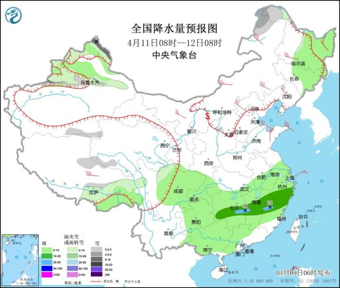 4月11日08時(shí)至12日08時(shí),新疆北疆北部和沿天山地區(qū)、內(nèi)蒙古東北部、黑龍江西北部、西藏東部和南部、青海西部、川西高原北部等地部分地區(qū)有小到中雪或雨夾雪,其中,新疆阿勒泰北部等地部分地區(qū)有中到大雪(5~9毫米)。東北地區(qū)東部、西藏東南部、西南地區(qū)東部、江淮大部、江南、華南西部和北部等地部分地區(qū)有小到中雨,其中,湖南中部、江西中部、福建西北部等地部分地區(qū)有大雨(25~40毫米)。內(nèi)蒙古中東部、東北地區(qū)大部、華北東北部、山東半島等地部分地區(qū)有4~6級(jí)風(fēng),其中,內(nèi)蒙古東部、西藏中部等地部分地區(qū)有6~7級(jí)風(fēng)。