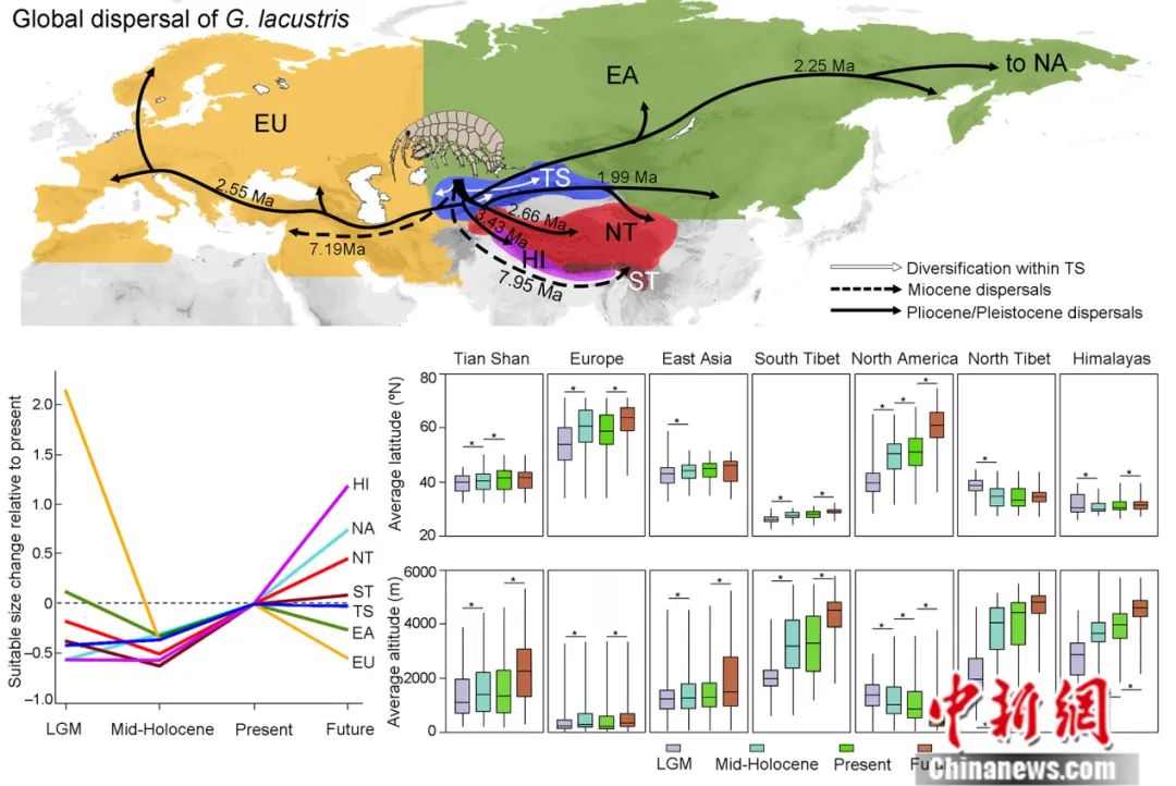 此次野外調(diào)查研究發(fā)現(xiàn),高山湖泊是冷水性鉤蝦全球遷移擴(kuò)展的通道,更新世氣候變冷形成大量高山湖泊或冰川湖,驅(qū)動(dòng)鉤蝦多次從天山拓殖到全球高山湖泊以及環(huán)北寒帶冰川湖泊中,該研究定義這種新的分化方式為“出芽式分化”。研究還發(fā)現(xiàn),未來氣候變暖將導(dǎo)致鉤蝦局限在更高海拔更高緯度,造成遺傳多樣性降低。
