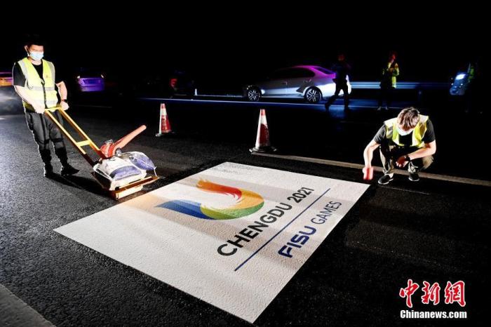 資料圖:圖為成都大運會專用車道地標設(shè)立現(xiàn)場。中新社記者 安源 攝