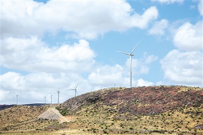 在南非北開普省德阿鎮(zhèn),中國龍源電力集團(tuán)南非公司運(yùn)營的德阿風(fēng)電項(xiàng)目風(fēng)機(jī)。