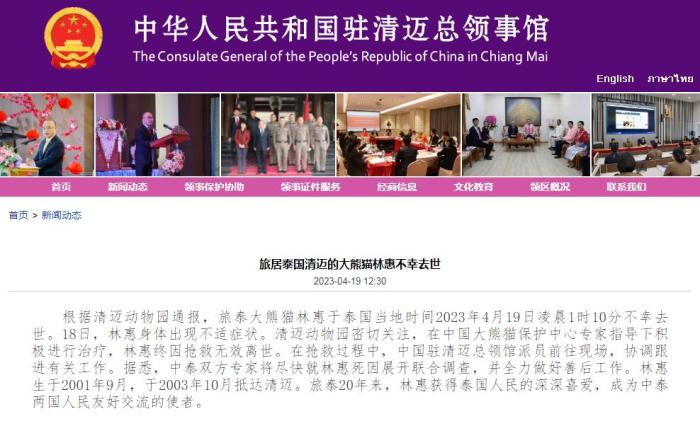 中新網(wǎng)4月19日電 據(jù)中國駐清邁總領事館消息,根據(jù)清邁動物園通報,旅泰大熊貓林惠于泰國當?shù)貢r間2023年4月19日凌晨1時10分不幸去世。