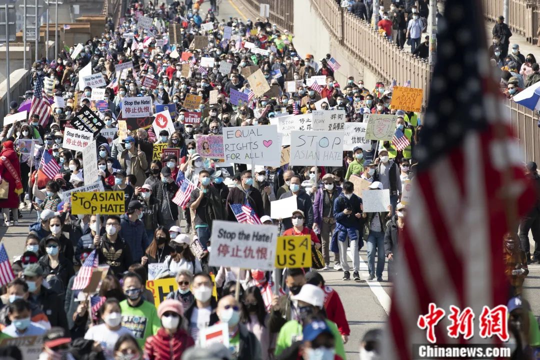 2021年,美國亞裔民眾受到種族歧視侵害事件頻發(fā),針對亞裔的仇恨犯罪備受社會關(guān)注。圖為2021年4月,紐約舉行反仇恨亞裔大游行。廖攀 攝