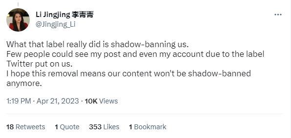 中國英文主持人李菁菁指出,推特的“官媒”標(biāo)簽實(shí)際是一種“影子禁令”,為暗中設(shè)限提供方便。“由于推特給我們貼上了標(biāo)簽,很少有人能看到我的帖子,甚至很難找到我的賬號(hào)。我希望這次刪除(標(biāo)簽)意味著我們發(fā)布的內(nèi)容不會(huì)再被暗中禁止。”