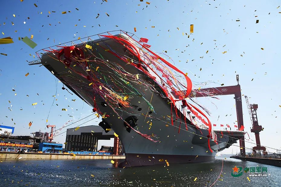 資料圖:中國第二艘航空母艦(中國首艘國產(chǎn)航母)下水儀式在中國船舶重工集團(tuán)公司大連造船廠舉行。圖片來源:中國軍網(wǎng)