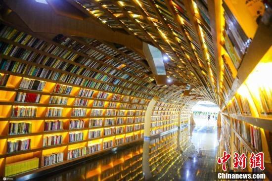 資料圖:河南省鄭州市,一所高校在圖書館內(nèi)打造了一條近百米長的“書海隧道”。