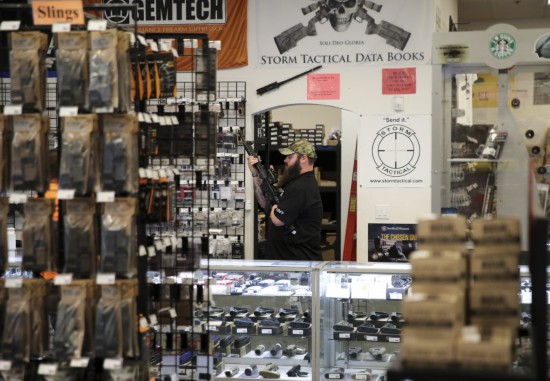 2017年10月4日,在美國(guó)拉斯維加斯的“新前線”槍械商店,一名店員為顧客展示槍支?!靶虑熬€”是當(dāng)?shù)匾?guī)模較大的一家槍械商店,售賣(mài)槍支彈藥、槍周邊用品、槍文化衍生品等。新華社記者王迎攝