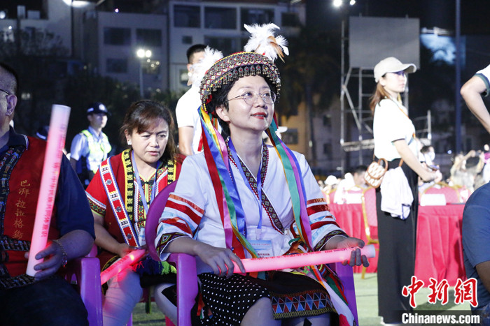 圖為4月22日晚,海南省臺聯(lián)副會長劉芳穎身著臺灣少數(shù)民族服飾出席在樂東舉行的“三月三”開幕活動(dòng)。 中新社記者 朱賀 攝