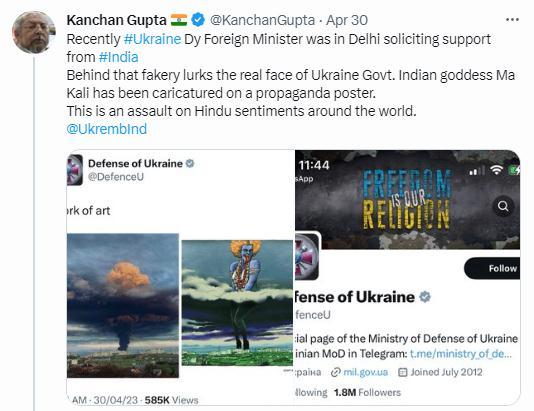 據(jù)俄新社報道,印度信息和廣播部高級顧問古普塔也對此表達了強烈的不滿,他在推特上轉(zhuǎn)發(fā)這一截圖,并寫道,“最近烏克蘭副外長曾在新德里請求印度支持。這張偽造圖背后隱藏著烏克蘭政府的真實面目。印度教女神卡莉被諷刺地畫在一張宣傳海報上。這是對全世界印度教徒感情的攻擊”。