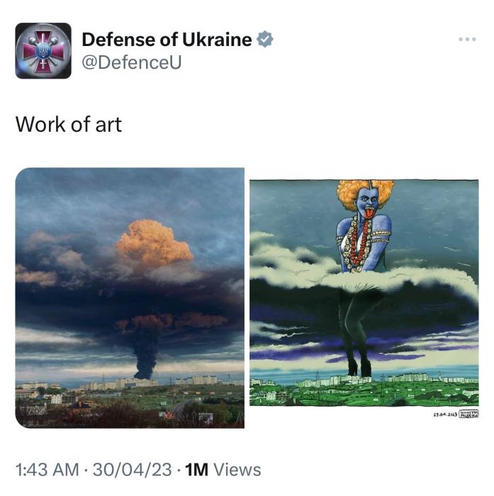 據(jù)俄新社、《印度斯坦時報》等多家媒體描述,烏國防部4月30日發(fā)布的這條推文中包含兩張圖片,第一張描繪了塞瓦斯托波爾灣一油庫遭無人機襲擊后升起的煙柱;另一張則是以第一張為基礎(chǔ)創(chuàng)作的漫畫,爆炸的濃煙中多了一名女性形象,她擺出與瑪麗蓮·夢露掩住裙擺相似的姿勢,而這一女性形象本身又與印度教女神卡莉相似。烏克蘭國防部對圖片的描述是“藝術(shù)作品(work of art)”。