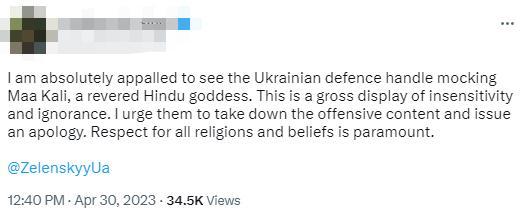 《印度斯坦時報》稱,這張圖被認為丑化了印度教女神,是“對印度教的不尊重”,推文“遭到強烈反對”“傷害了印度人的感情”。甚至有印度網(wǎng)友呼吁印度官方干預(yù)此事。目前,烏克蘭國防部已經(jīng)刪除該推文。