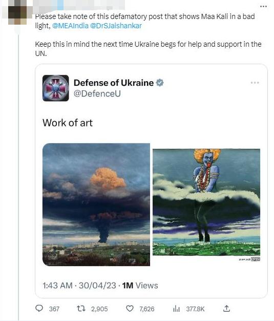 有推特網(wǎng)友@印度外交部和外長蘇杰生“請注意這篇詆毀女神卡莉的誹謗帖子。下次烏克蘭在聯(lián)合國尋求幫助和支持時,請記住這一點?!?/p>
