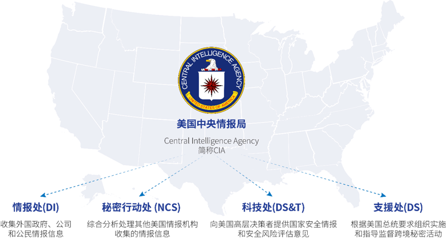 CIA是美國聯(lián)邦政府主要情報機(jī)構(gòu)之一,總部位于美國弗吉尼亞州蘭利,下設(shè)情報處(DI)、秘密行動處(NCS)、科技處(DS&T)、支援處(DS)四個部門。其主要業(yè)務(wù)范圍涉及:收集外國政府、公司和公民情報信息;綜合分析處理其他美國情報機(jī)構(gòu)收集的情報信息;向美國高層決策者提供國家安全情報和安全風(fēng)險評估意見;根據(jù)美國總統(tǒng)要求組織實施和指導(dǎo)監(jiān)督跨境秘密活動等。
