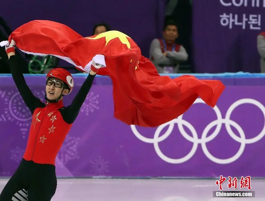 2018年2月22日,在平昌冬奧會(huì)短道速滑男子500米決賽中,中國(guó)選手武大靖奪得金牌。圖為武大靖手舉五星紅旗慶祝勝利。中新社記者 宋吉河 攝