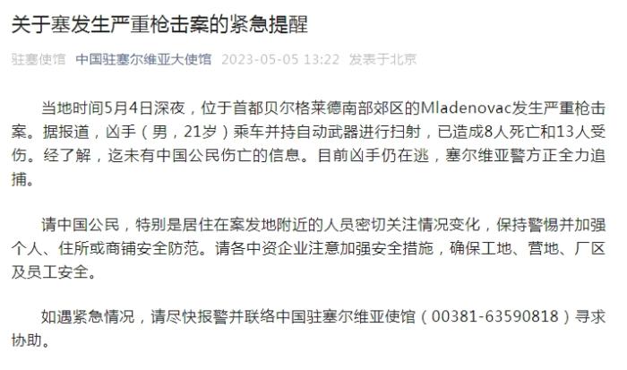 中新網(wǎng)5月5日電 據(jù)中國駐塞爾維亞大使館微信公眾號(hào)消息,當(dāng)?shù)貢r(shí)間5月4日深夜,位于首都貝爾格萊德南部郊區(qū)的Mladenovac發(fā)生嚴(yán)重槍擊案。據(jù)報(bào)道,兇手(男,21歲)乘車并持自動(dòng)武器進(jìn)行掃射,已造成8人死亡和13人受傷。經(jīng)了解,迄未有中國公民傷亡的信息。目前兇手仍在逃,塞爾維亞警方正全力追捕。