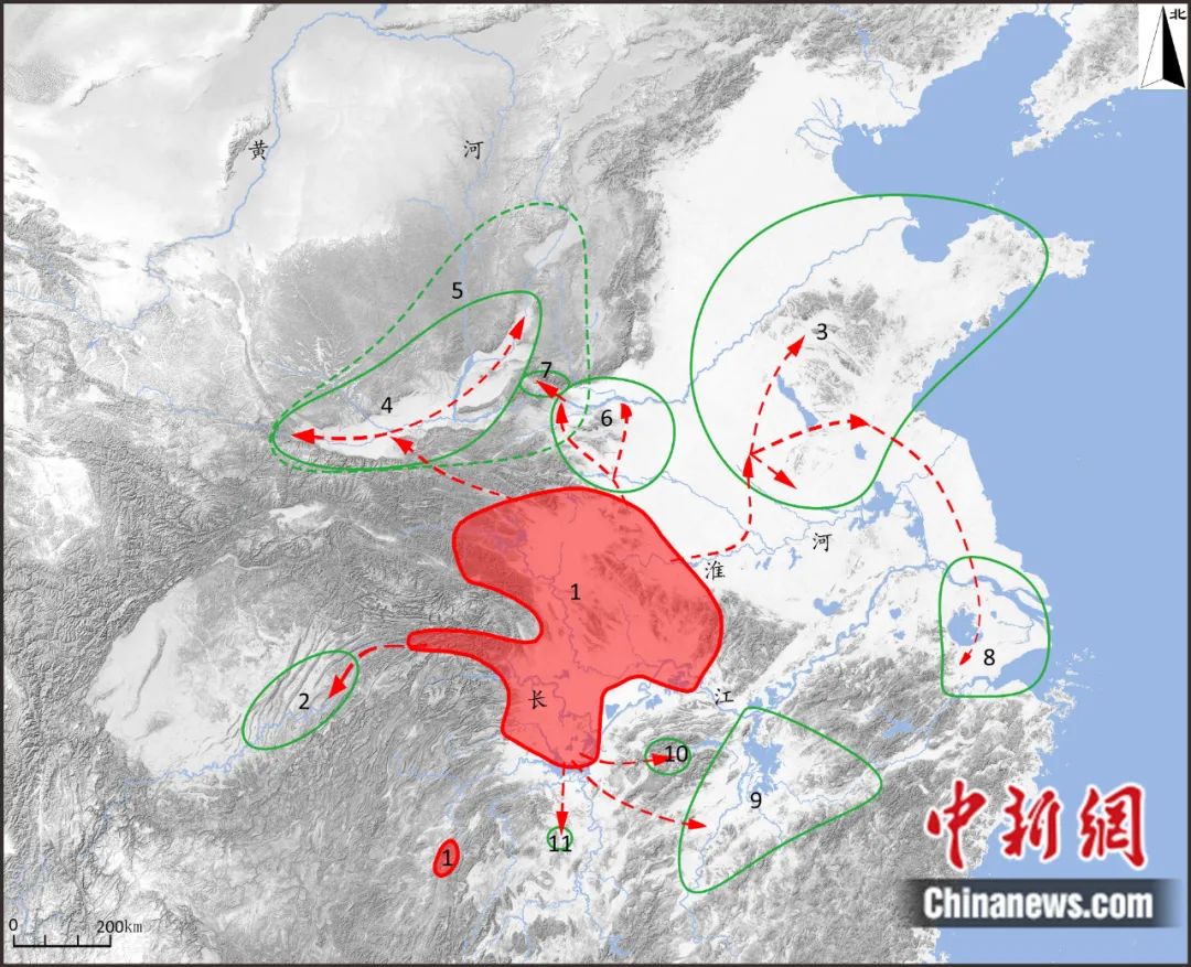 屈家?guī)X文化對外擴(kuò)張路線示意圖(紅色區(qū)域為屈家?guī)X文化主要分布范圍)。受訪者 供圖