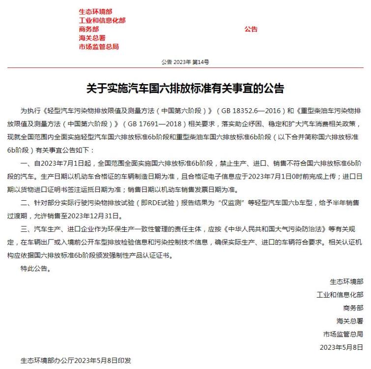 其中要求,自2023年7月1日起,全國范圍全面實施國六排放標(biāo)準(zhǔn)6b階段,禁止生產(chǎn)、進(jìn)口、銷售不符合國六排放標(biāo)準(zhǔn)6b階段的汽車。生產(chǎn)日期以機(jī)動車合格證的車輛制造日期為準(zhǔn),且合格證電子信息應(yīng)于2023年7月1日0時前完成上傳;進(jìn)口日期以貨物進(jìn)口證明書簽注運(yùn)抵日期為準(zhǔn);銷售日期以機(jī)動車銷售發(fā)票日期為準(zhǔn)。