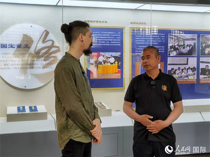 人民網(wǎng)意大利籍記者采訪(fǎng)云居寺文物管理處黨支部副書(shū)記、副主任李曙平(右一)。人民網(wǎng) 魯揚(yáng)攝