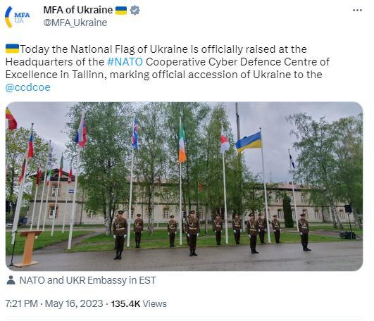 烏克蘭外交部在推特上發(fā)布圖片并配文稱,“今天,烏克蘭國旗在位于塔林的北約合作網(wǎng)絡防御卓越中心總部正式升起,標志著烏克蘭正式加入該組織?!?/p>