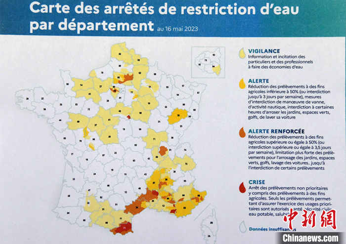 法國(guó)官方本周發(fā)表的一份最新報(bào)告顯示,法國(guó)今年炎熱干旱和水資源短缺問(wèn)題可能比去年更加嚴(yán)重。報(bào)告公布的地圖標(biāo)明了需要限制用水的省份。 中新社記者 李洋 攝