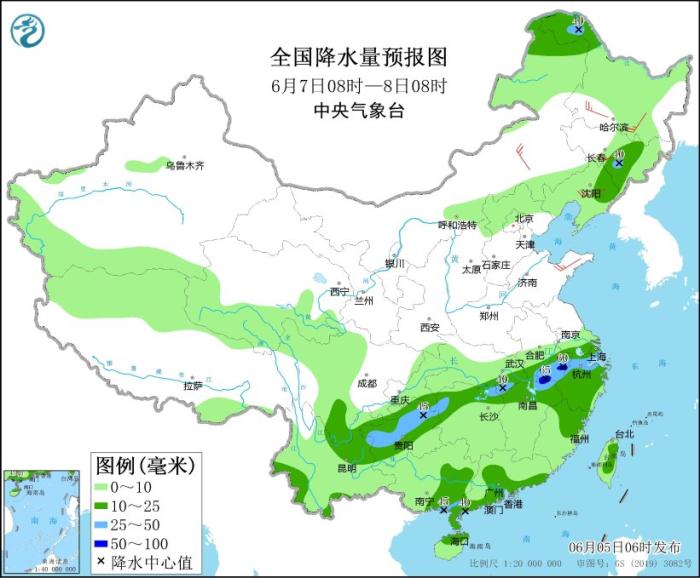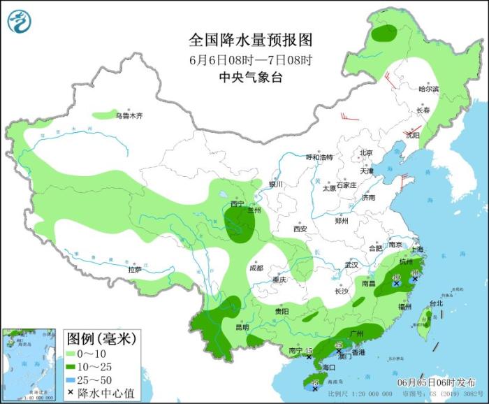 6月6日08時(shí)至7日08時(shí),內(nèi)蒙古東北部、東北地區(qū)東部和北部、青藏高原北部、甘肅中南部、江南東部和南部、西南地區(qū)大部、華南、臺(tái)灣島等地部分地區(qū)有小到中雨,局地有大雨(25~45毫米)。內(nèi)蒙古中東部、東北地區(qū)南部、山東半島等地部分地區(qū)有4~5級(jí)風(fēng)(見圖2)。