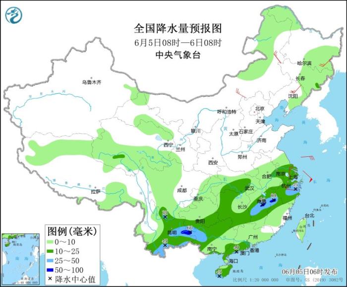 6月5日08時(shí)至6日08時(shí),江淮東部、江漢南部、江南西部和中北部、西南地區(qū)南部、華南西部和南部等地部分地區(qū)有中到大雨,其中,江西中北部、廣西西部、云南東部等地局地有暴雨(50~80毫米)。內(nèi)蒙古中東部、東北地區(qū)、江南東北部等地部分地區(qū)有4~5級(jí)風(fēng)(見圖1)。東海北部海域?qū)⒂?~7級(jí)風(fēng)、陣風(fēng)8級(jí)。
