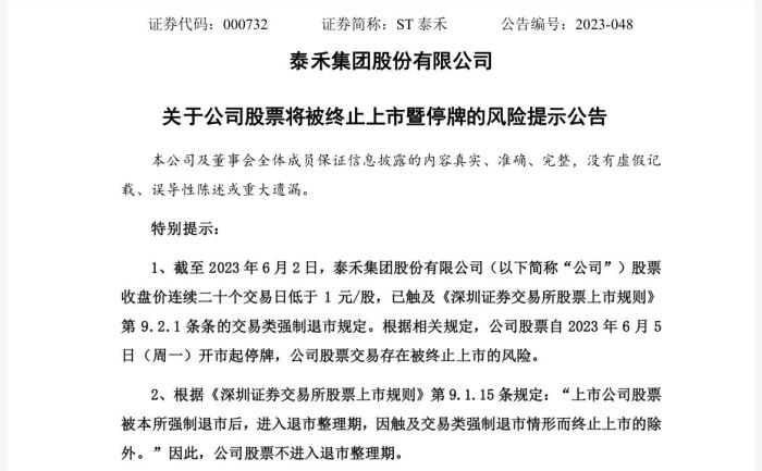 6月2日晚間,ST泰禾公告,截至當(dāng)日,公司股票收盤價連續(xù)20個交易日低于1元/股,已觸及交易類強(qiáng)制退市規(guī)定。根據(jù)相關(guān)規(guī)定,公司股票自6月5日開市起停牌,公司股票交易存在被終止上市的風(fēng)險(xiǎn)。
