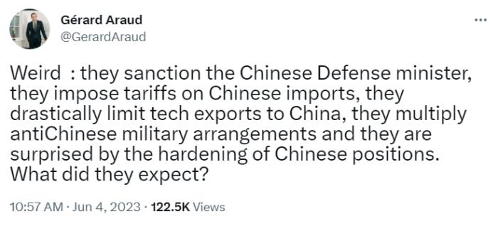 中新網(wǎng)6月5日電 日前,法國前駐美大使熱拉爾·阿羅在推特上提出一個(gè)值得思考的問題,“奇怪,他們(美國)制裁中國國防部長,他們對(duì)中國進(jìn)口商品征收關(guān)稅,他們大幅限制對(duì)華技術(shù)出口……現(xiàn)在他們反而對(duì)中國立場(chǎng)的強(qiáng)硬感到驚訝。美國到底想要什么?”