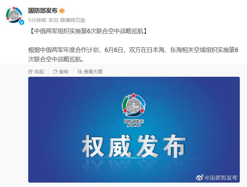 中新網(wǎng)6月6日電 據(jù)國防部新聞局官方微博消息,根據(jù)中俄兩軍年度合作計(jì)劃,6月6日,雙方在日本海、東海相關(guān)空域組織實(shí)施第6次聯(lián)合空中戰(zhàn)略巡航。