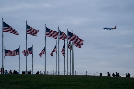 2022年11月10日,在美國首都華盛頓,一架飛機從美國國旗上空飛過。新華社記者劉杰攝