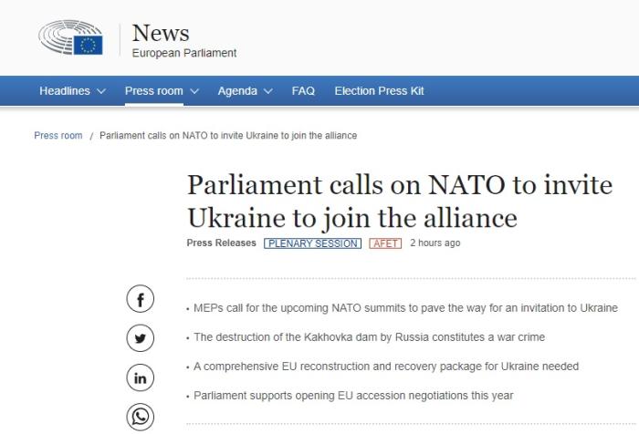 歐洲議會(huì)呼吁北約邀請(qǐng)烏克蘭加入。圖片來源:歐洲議會(huì)網(wǎng)站截圖