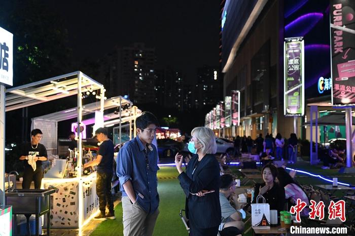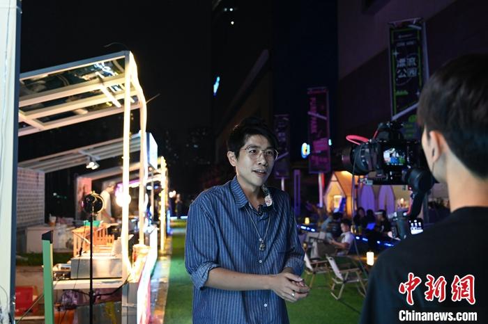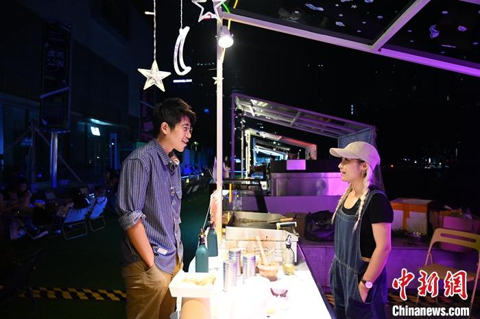 夜幕下的深圳市南山區(qū)人潮涌動(dòng),一處集合了美食、潮流、游戲等元素的市集內(nèi),臺(tái)灣青年周伯彥正與幾位工作人員一起檢查場地布置和物料擺放,為市集營業(yè)做最后的準(zhǔn)備。