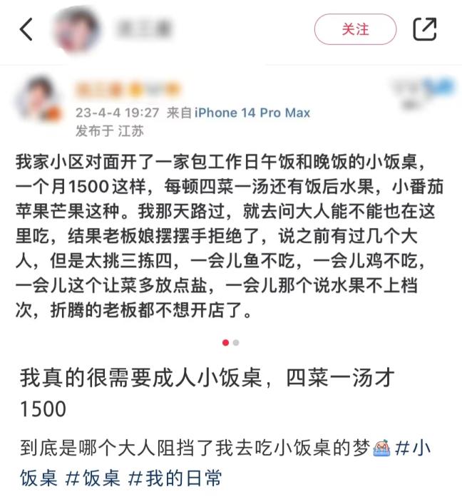 也有網(wǎng)友表示,由于自己吃太多,還被小飯桌漲了價(jià)?!耙?yàn)槌扇撕蛯W(xué)生食量和需求不同,價(jià)格都需要跟小飯桌重談?!?/p>