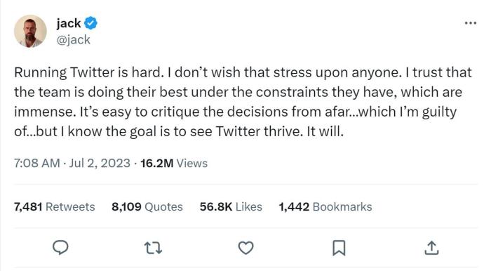 推特聯(lián)合創(chuàng)始人、前首席執(zhí)行官杰克·多爾西隨后發(fā)表了對(duì)此事的看法,他表示,“運(yùn)營推特是很困難的。我不希望任何人受到這種壓力。我相信這個(gè)團(tuán)隊(duì)在巨大的限制條件下,正在盡最大努力。從遠(yuǎn)處批評(píng)這些決定是很容易的……我也對(duì)此感到歉疚……但我知道他們的目標(biāo)是要看到推特的繁榮。它會(huì)的。”