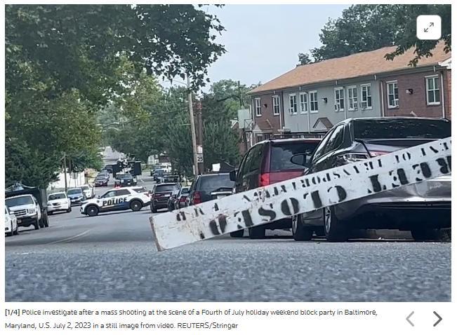 當(dāng)?shù)貢r(shí)間7月2日凌晨,美國(guó)馬里蘭州巴爾的摩的一場(chǎng)社區(qū)派對(duì)結(jié)束后,發(fā)生了大規(guī)模槍擊事件,造成2人死亡,28人受傷,其中包括14名未成年人。圖片來源:路透社報(bào)道截圖
