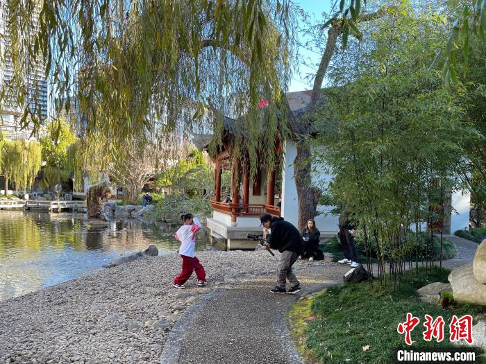 在湖邊,中國戲曲元素結(jié)合英文說唱的音樂吸引了游客們駐足。在悉尼從事汽修工作十余年的華人楊女士帶著兒子艾迪在湖邊拍攝音樂短視頻。穿著印有紅色京劇臉譜衛(wèi)衣的艾迪伴著動(dòng)感音樂起舞?!拔曳浅O矚g這里中西結(jié)合的感覺。希望在公共場合拍攝能培養(yǎng)孩子的自信心?!睏钆空f。