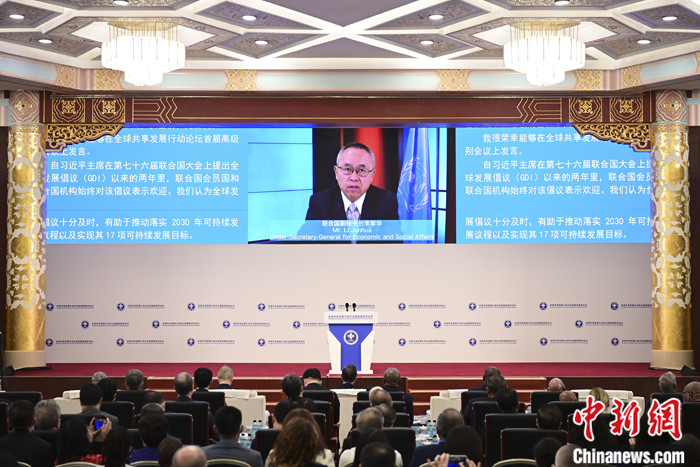 7月10日,全球共享發(fā)展行動論壇首屆高級別會議在北京開幕。聯(lián)合國副秘書長李軍華在開幕式作視頻致辭時指出,實(shí)施2030年可持續(xù)發(fā)展議程的時間框架已過半,但只有約12%的可持續(xù)發(fā)展目標(biāo)有望在2030年之前實(shí)現(xiàn),聯(lián)合國呼吁各會員國加大投入,為有需要的國家增加可負(fù)擔(dān)的長期發(fā)展融資。 中新社記者 田雨昊 攝