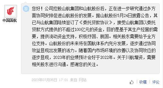 對(duì)于上述收購,中國國航于7月5日在投資者互動(dòng)平臺(tái)回應(yīng)稱,公司控股山航集團(tuán)和山航股份后,正在進(jìn)一步研究通過多方面協(xié)同安排促進(jìn)山航股份的發(fā)展。