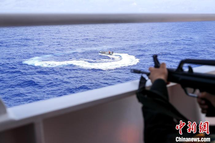 兩發(fā)紅色信號彈升空,一聲長汽笛響徹海域。指揮所通過16國際頻道用英語向高速接近的“海盜艇”發(fā)出警告:“你迅速離開,否則后果自負?!彪S船取證人員全程照相、錄像取證。