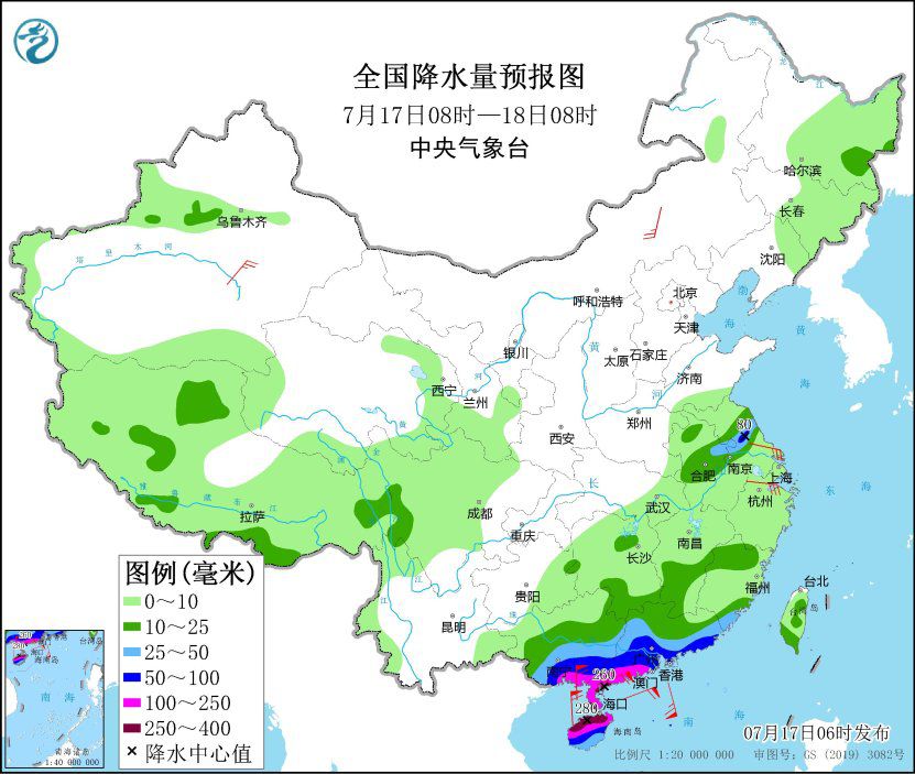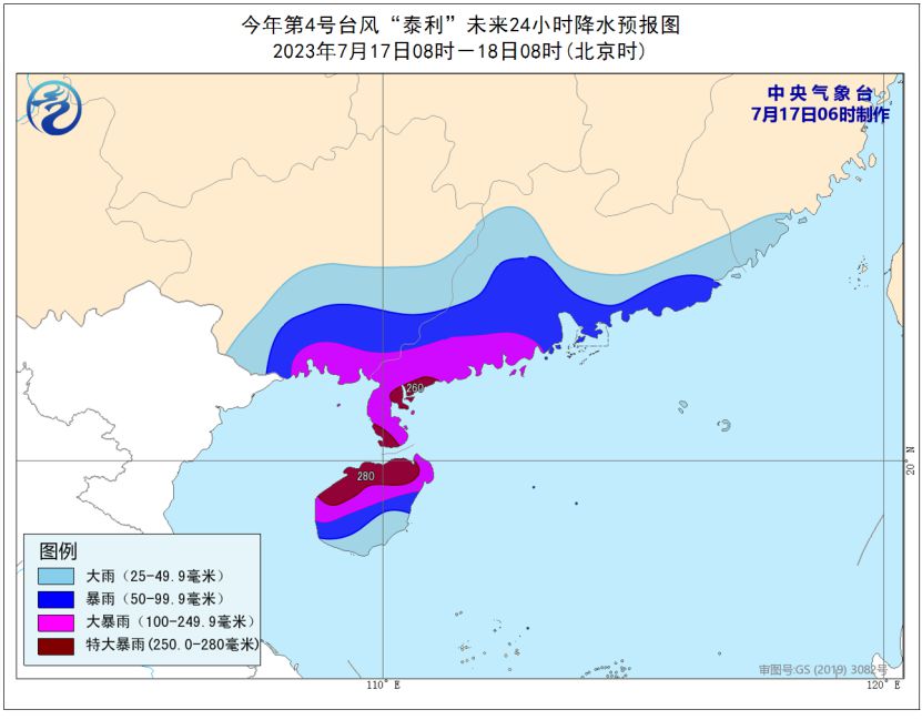 同時(shí),廣東西部和南部、廣西中南部、海南島、福建南部等地部分地區(qū)有大到暴雨,其中,廣西南部、廣東西南部、海南島中北部等地部分地區(qū)有大暴雨,廣東西南部沿海、海南島北部等地局地特大暴雨(250~280毫米)。
