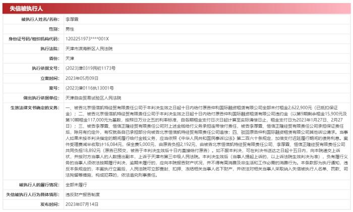 中國執(zhí)行信息公開網(wǎng)顯示,目前恒信璽利存在多條被執(zhí)行人信息,恒信璽利和李厚霖也多次收到限制消費令。