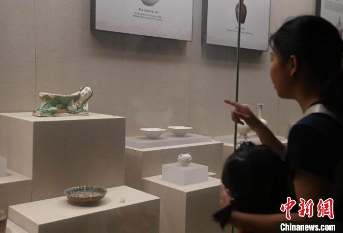 2023年7月13日,人們?cè)诎不詹┪镌簠⒂^“宋三彩臥女抱鵝枕”(左上)?!≈行律缬浾?韓蘇原 攝
