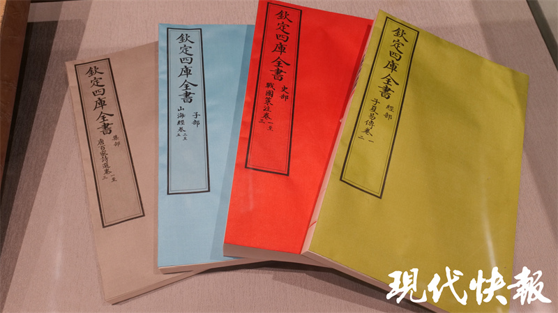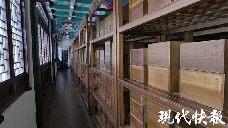 文匯閣二樓、三樓收藏了一部《四庫全書》,據(jù)了解,這部《四庫全書》是2013年由商務印書館榮譽出版、揚州國書文化公司策劃制作的原樣、原大、原色《四庫全書》復制本。它與原書大小、顏色、紙質、裝幀相同,封面仍是絹帛五色:經部綠色、史部紅色、子部月白色、集部灰黑色、總目黃色。書籍與書函、書架配套,共計木函6144個、書架128個?!端膸烊珪返难b潢非??季?,每部書籍都用兩片楠木片夾住,束以綢帶,再放入楠木盒中。盒蓋上刻有書籍的書名和所屬部類順序等信息,以便查閱?,F(xiàn)在,游客經過預約就可以可到二樓參觀《四庫全書》部分藏書,親身感受這套浩瀚巨制。